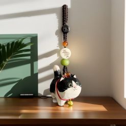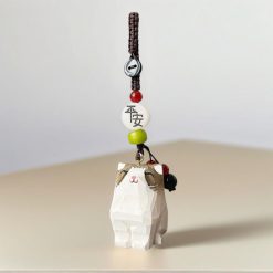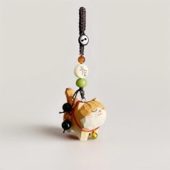 Móc khóa mèo trắng lục lạc gỗ điêu khắc thủ công