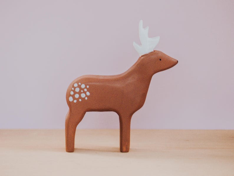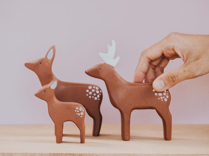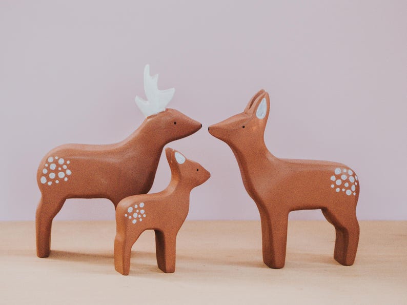 Khơi gợi trí tưởng tượng và tình yêu thiên nhiên với bộ hươu gỗ thủ công. Được chạm khắc tinh xảo và sơn tay sống động, bộ hươu gồm hươu đực, hươu cái và hươu con – phù hợp cho trẻ chơi Montessori, Waldorf hoặc dùng để kể chuyện và trang trí Noel.