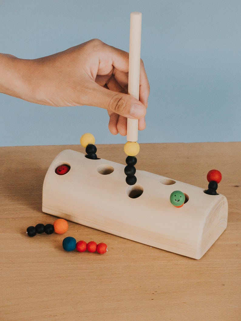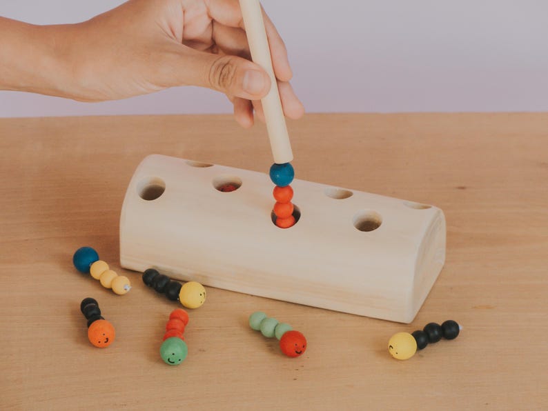 Khám phá trò chơi vui nhộn và giáo dục với đồ chơi gỗ bắt sâu bằng nam châm. Bộ đồ chơi gồm khối gỗ có lỗ, những chú sâu bằng hạt gỗ gắn nam châm và một chiếc cần nam châm để “câu sâu”. Bé sẽ rèn luyện sự khéo léo, phối hợp tay – mắt và phát triển kỹ năng vận động tinh thông qua trò chơi giả lập bắt sâu.