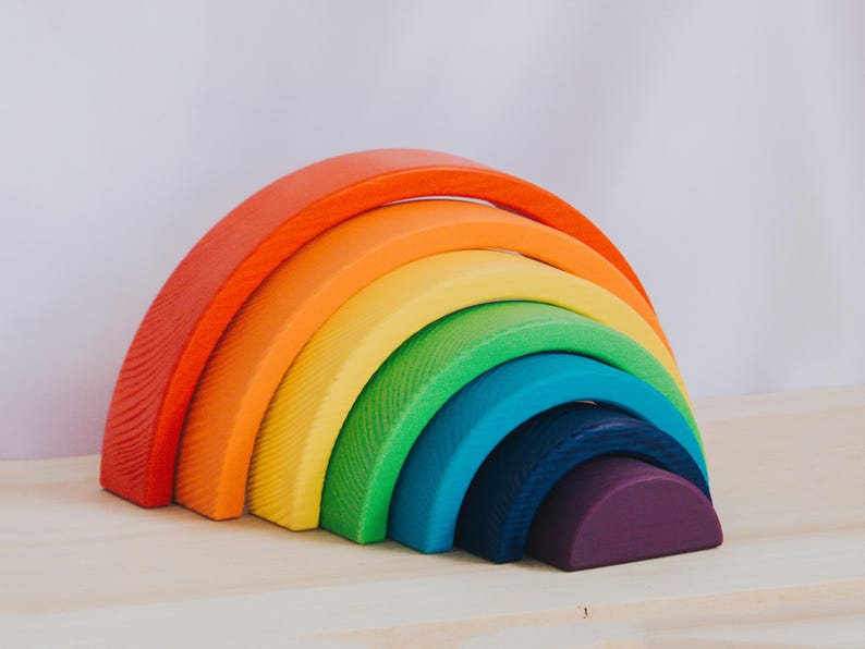 Khám phá thế giới sáng tạo cùng đồ chơi xếp chồng cầu vồng và mặt trời bằng gỗ. Với các mảnh gỗ hình lưỡi liềm sơn tay rực rỡ kết hợp cùng mặt trời, bé được trải nghiệm vừa học vừa chơi, rèn luyện sự khéo léo và phát triển trí tưởng tượng. Đây là món đồ chơi mở, khuyến khích bé tự do khám phá theo phong cách Montessori và Waldorf.