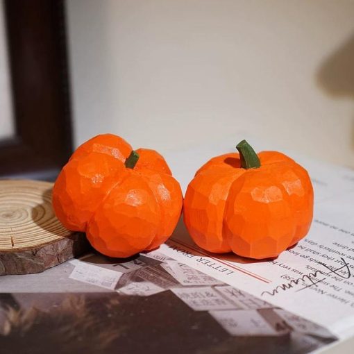 Tượng bí ngô gỗ chạm tay giúp góc làm việc và kệ trang trí thêm ấm áp, nổi bật không khí thu/Halloween; món quà décor nhỏ gọn, dễ phối với nhiều phong cách nội thất.