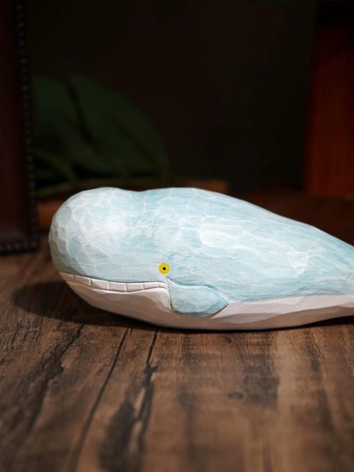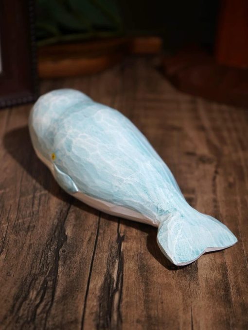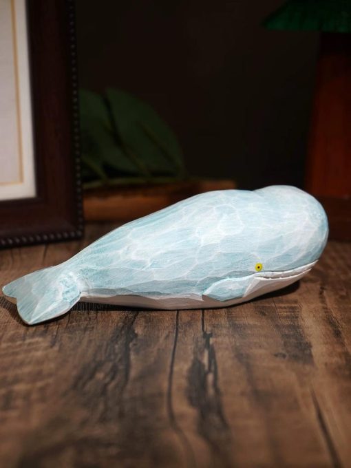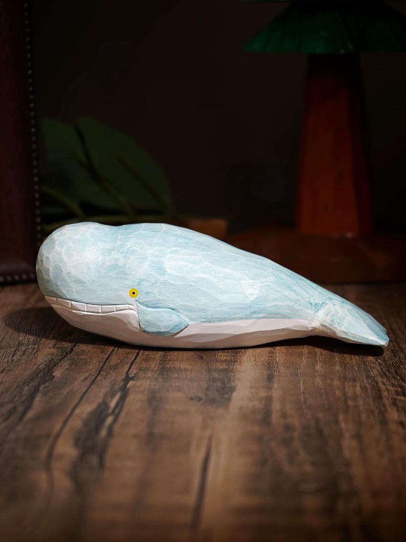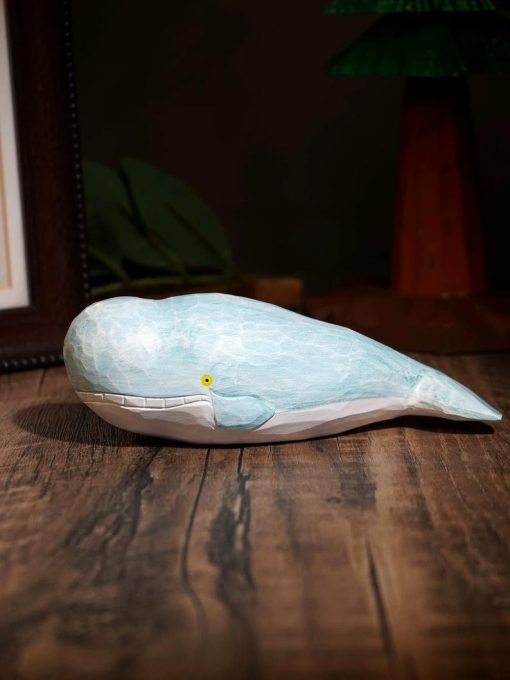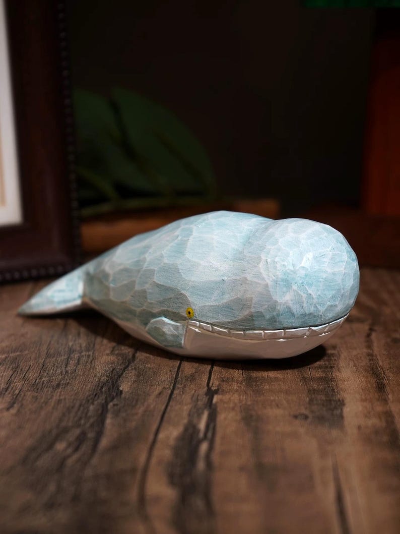 Làm mới góc làm việc với tượng cá voi gỗ chạm tay sắc nét, gam xanh dịu mắt giúp không gian thư thái và nổi bật trên bàn hay kệ sách.
