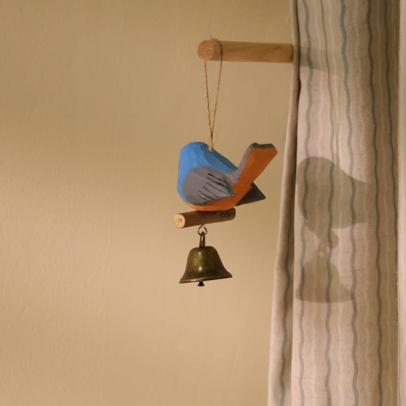 Mang lại điểm nhấn mộc mạc và tươi vui cho không gian, tượng chim gỗ màu xanh sơn tay treo kèm chuông tạo âm thanh leng keng nhẹ nhàng khi chuyển động. Kích thước cao 10.2 cm, nhỏ gọn để treo cửa sổ, hiên nhà, cây thông Noel hoặc đặt trang trí góc bàn.