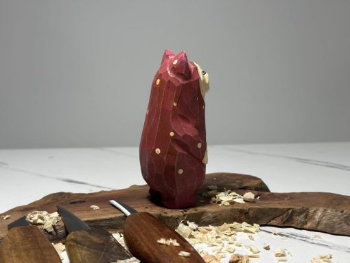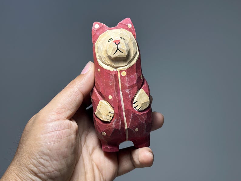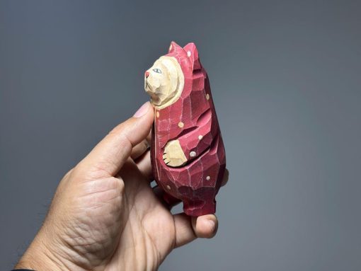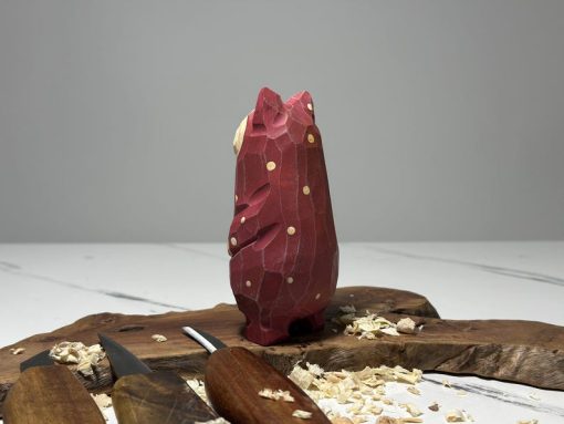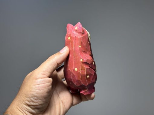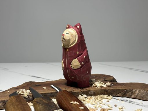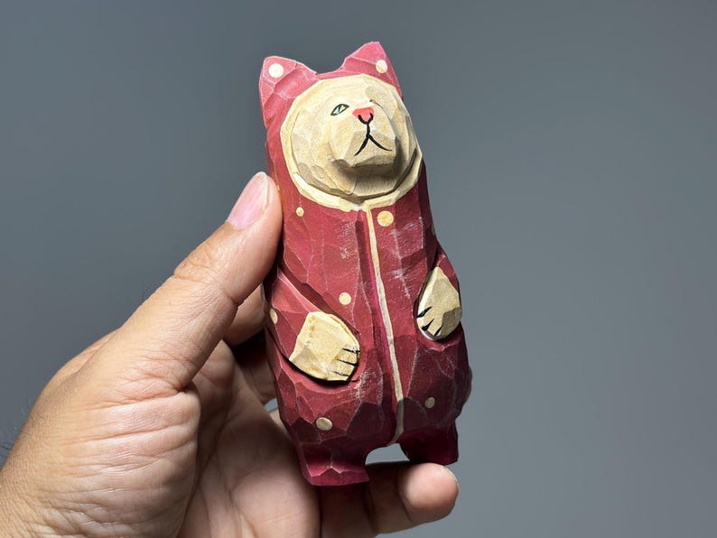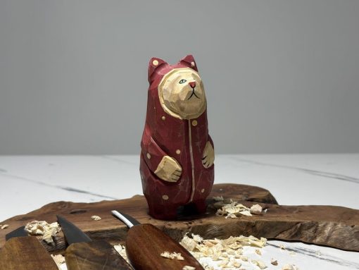 Tượng mèo gỗ áo đỏ chấm bi mang hơi thở mộc mạc và vui mắt, giúp góc bàn hay kệ sách nổi bật ngay tức thì—một điểm nhấn thủ công đáng yêu cho người yêu décor.