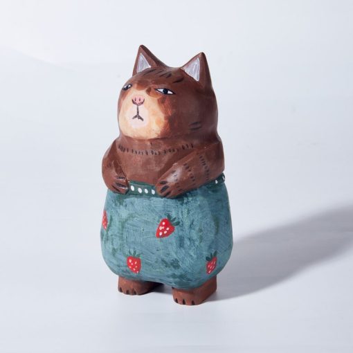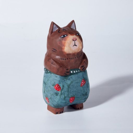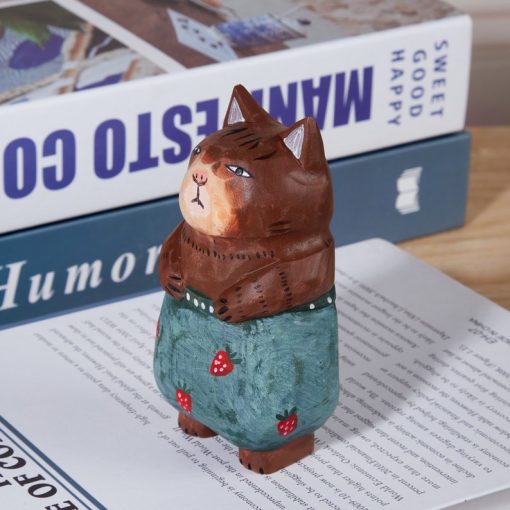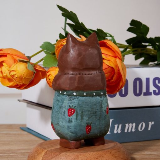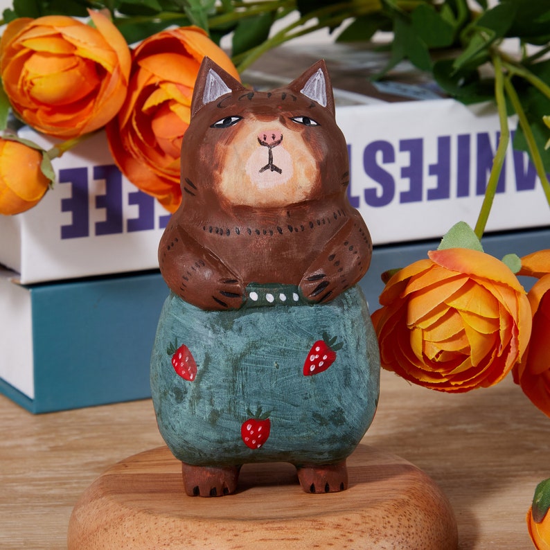Tượng mèo khắc gỗ giúp góc bàn hay kệ sách thêm sinh động; tạo hình “quần dâu” ngộ nghĩnh mang lại cảm giác vui mắt cho không gian sống và làm việc.