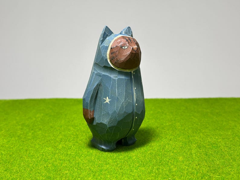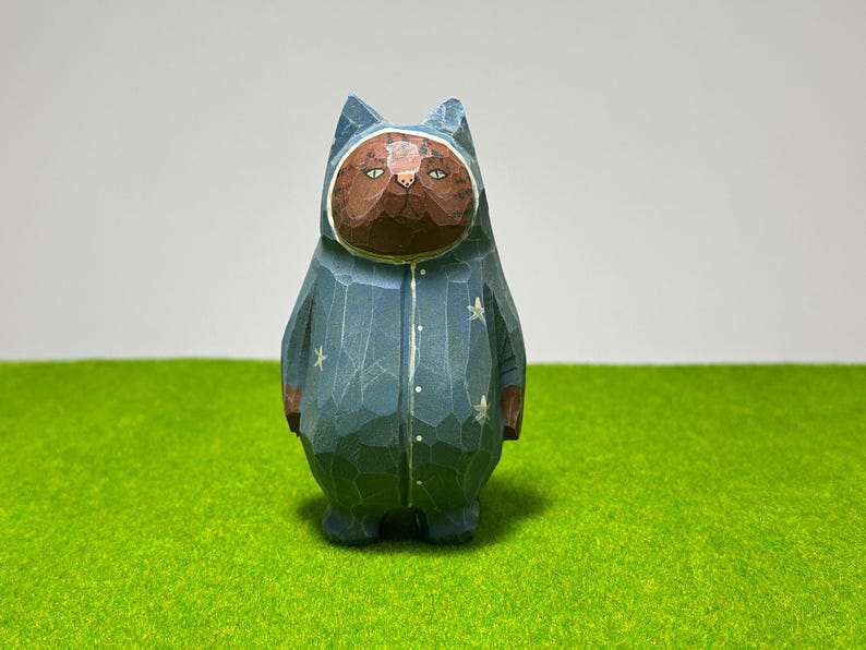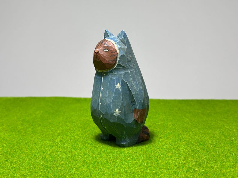 – Thiết kế: mèo mặc áo liền xanh điểm sao, bề mặt khắc facet mộc mạc.