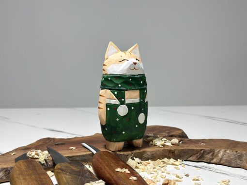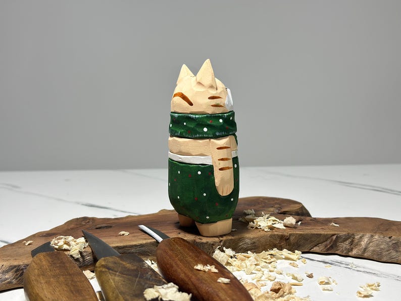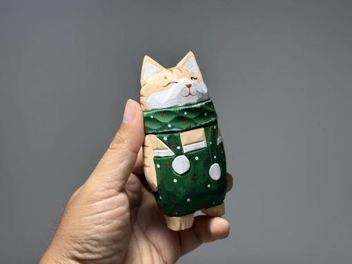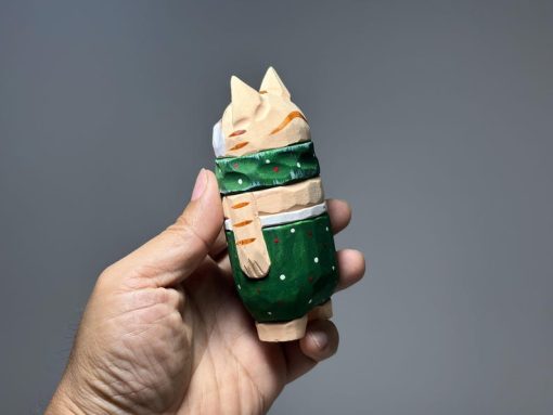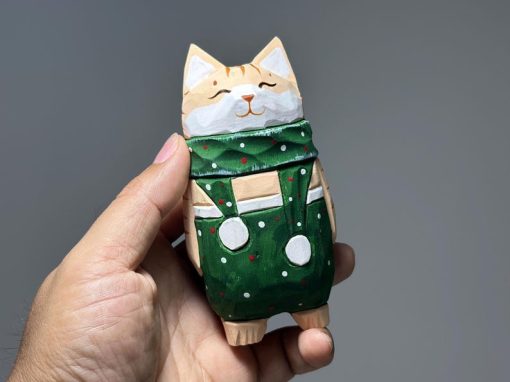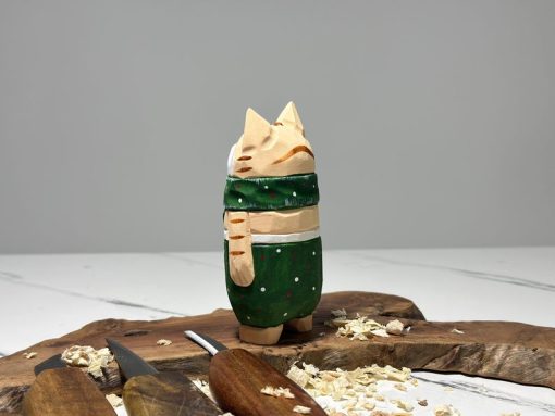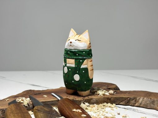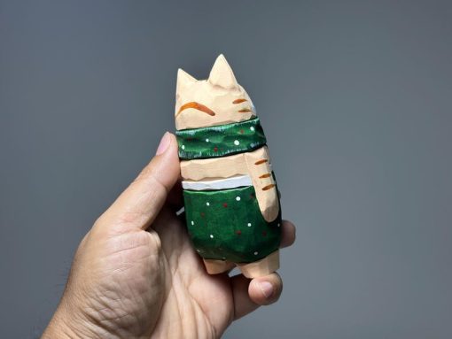 Tượng mèo gỗ chạm tay 10 cm, khăn & yếm xanh Noel
