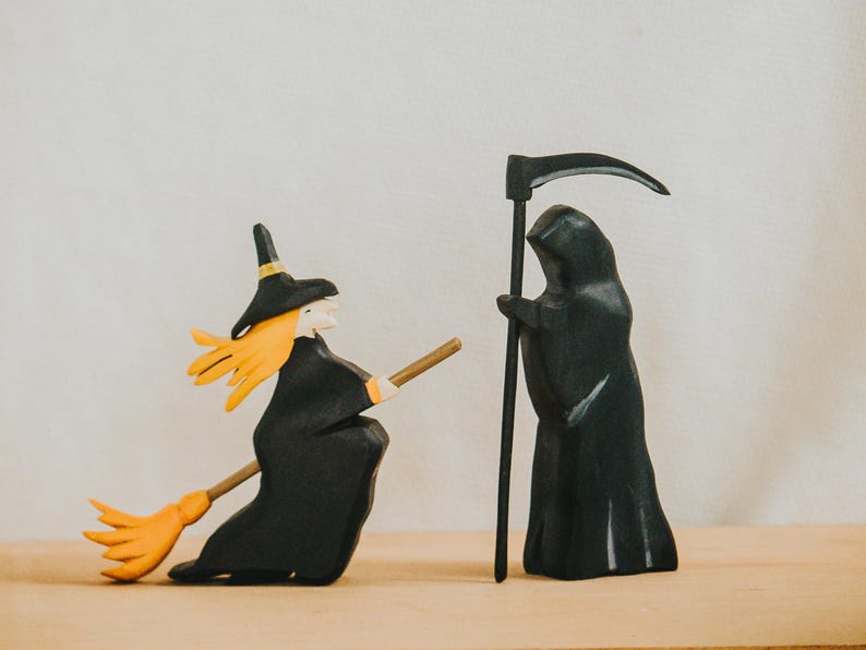 Thêm chút ma mị nhưng vẫn thân thiện cho mùa lễ hội với tượng thần chết gỗ thủ công kèm lưỡi hái. Được làm từ gỗ tự nhiên và sơn tay an toàn, sản phẩm mang phong cách Waldorf mềm mại, bo tròn an toàn, phù hợp cho trẻ nhỏ chơi Halloween giả lập, trang trí bàn lễ hội hoặc sưu tầm.